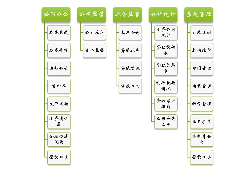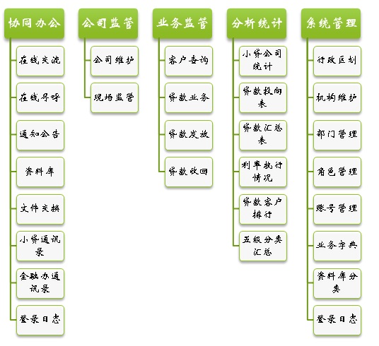 系統(tǒng)主功能模塊包括:協同辦公、公司監(jiān)管、業(yè)務監(jiān)管、分析統(tǒng)計、系統(tǒng)管理等,各子功能模塊見下圖: